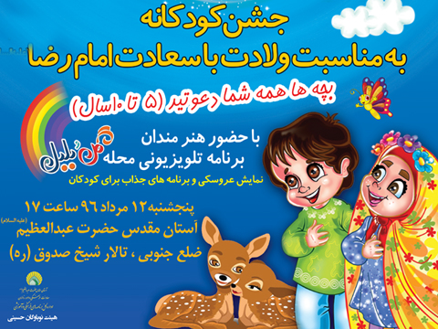 به گزارش روابط عمومی آستان مقدس حضرت عبدالعظیم الحسنی علیه السلام، جشن کودکانه ولادت امام رضا علیه السّلام در روز پنجشنبه 12 مردادماه از ساعت 17 تا 20 با تلاوت قاری نوجوان آغاز و با اجرای برنامه و مسابقه مذهبی توسط حجت الاسلام شاکری، اجرای آیتم کودک بهمراه نمایش عروسکی و حضور جمعی از هنرمندان برنامه تلویزیونی گل و بلبل در تالار شیخ صدوق (ره) ادامه خواهد یافت.